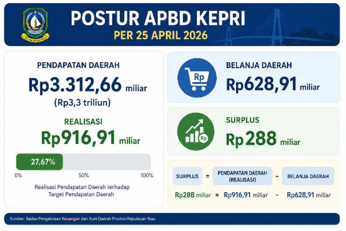 Jika pendapatan terealisasi sebesar 916,91 miliar dikurangi belanja daerah Rp628,91 miliar, masih tersisa atau surplus sebesar Rp288 miliar. Berikut ini rincian Postur APBD Kepri per 25 April 2026: