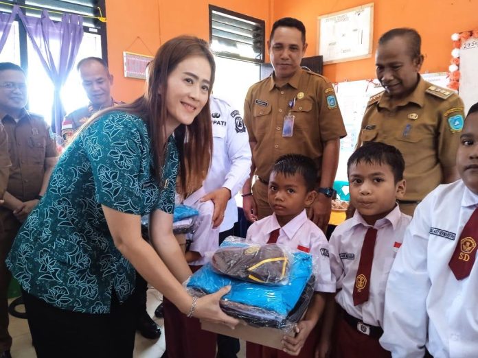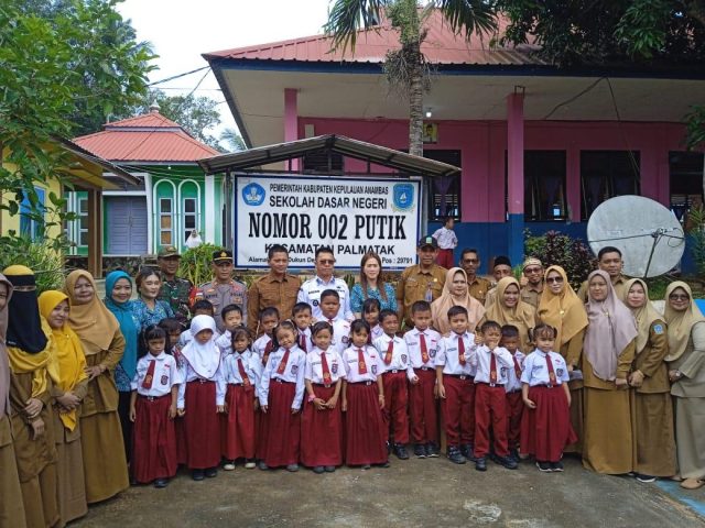 ANAMBAS, KABARTERKINI.co.id – Bupati Kepulauan Anambas Aneng bersama wakilnya, Raja Bayu serta Ketua Tim Penggerak PKK, Sinta Aneng menyerahkan perlengkapan sekolah bagi pelajar SD Negeri 002 Putik, Kecamatan Palmatak, Selasa 30 September 2025.