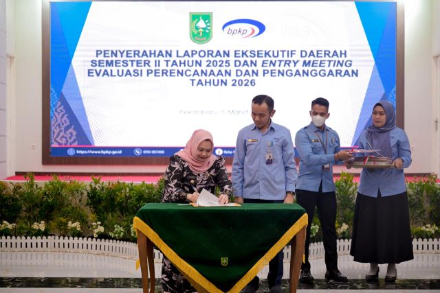 PEKANBARU, KABARTERKINI.co.id – Bupati Bengkalis Kasmarni menerima Laporan Eksekutif Daerah Semester II sekaligus mengikuti entry meeting evaluasi perencanaan dan penganggaran. Acara digelar Badan Pengawasan Keuangan dan Pembangunan (BPKP) Perwakilan Provinsi Riau di Balai Serindit Pekanbaru, Kamis 5 Maret 2026.