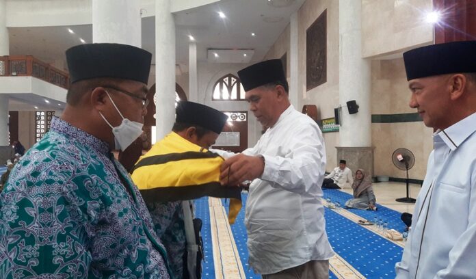 BUPATI Natuna Wan Siswandi saat mengalungkan surban pada salah seorang CJH asal Natuna