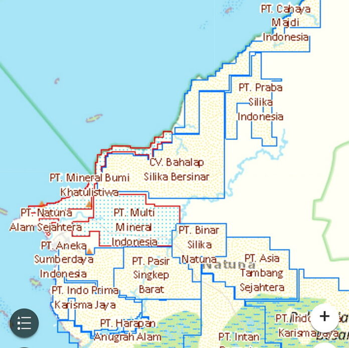 6. PT. Intan Permata Mineral (IPM). WIUP (Pencadangan) dari Kementerian ESDM. Berlaku SK: Nihil. Batas akhir SK: Nihil. Lokasi tambang: Desa Kelarik Utara, Kecamatan Bunguran Utara, Desa Gunung Putri, Kecamatan Bunguran Barat, Desa Sedarat Baru, Kecamatan Bunguran Batubi. Kode Komoditas: Mineral Bukan Logam Jenis Tertentu. Komoditas: Pasir Kuarsa. Nomor SK: Nihil. Luas wilayah: 6.359,07 hektar.