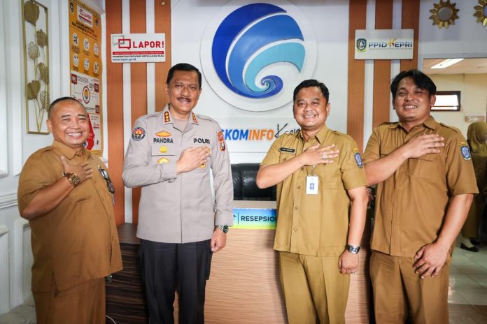 TANJUNGPINANG, KABARTERKINI.co.id – Kepala Diskominfo Kepri Hendri Kurniadi melalui Kabid Komunikasi dan Kehumasan, Trio Andana menyambut kunjungan Kepala Bidang Humas Polda Kepri Kombes Pol. Zahwan Pandra Arsyad, kemarin. Dalam penyambutan digelar pertemuan di Kantor Diskominfo Kepri di Tanjungpinang.