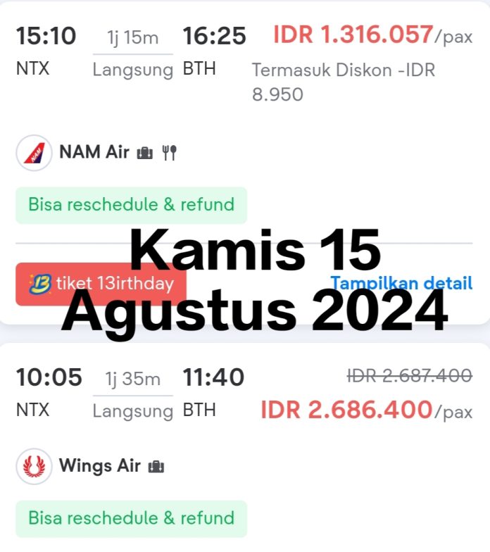 NATUNA, KABARTERKINI.co.id – Tiket pesawat Natuna-Batam, dilansir dari www.tiket.com, Kamis 15 Agustus 2024, pukul 13.29 WIB, Maskapai NAM Air mematok harga sekitar Rp1,3 juta atau tepatnya, Rp1,316.057, sedangkan Wing Air mematok harga sekitar Rp2,6 juta atau tepatnya, Rp2.686.400. Dengan selisih harga sebesar Rp1.372.343 ini, menjadi pertanyaan, kenapa jarak perjalanan penerbangan sama, harga menjadi berbeda?