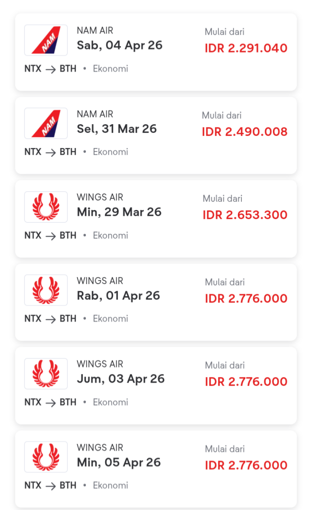 6. Maskapai Wing Air dari Ranai (Natuna/NTX) – Hang Nadim (Batam/BTH), Ahad 5 April 2026, harga tiket Rp2.776.000, kelas Ekonomi.