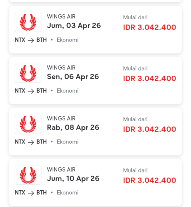 1. Maskapai Wing Air dari Ranai (Natuna/NTX) – Hang Nadim (Batam/BTH), Jumat 3 April 2026, harga tiket Rp3.042.400, kelas Ekonomi.