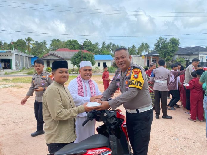 NATUNA, KABARTERKINI.co.id – Kepala Satuan Lalu Lintas (Satlantas) Polres Natuna Iptu Erwan Toni beserta jajaran kembali menggelar kegiatan sosial, dengan membagikan 200 paket makanan dan minuman kepada jamaah Masjid Ibnu Salim, Ranai, Jumat 12 Desember 2025. Pembagian dua ratusan paket makanan dan minuman ini, merupakan rangkaian program Jumat Berkah.