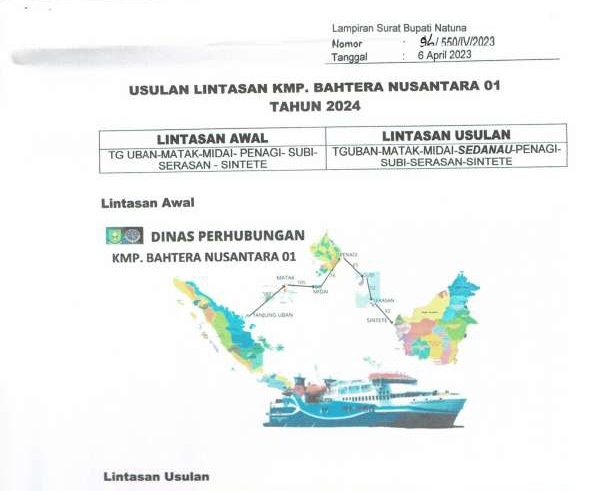 Jadi usulan pembangunan, hingga sandar kapal, sambungnya, murni usulan Bupati Natuna Wan Siswandi. Sedangkan surat usulan sandar Kapal RoRo ditujukan ke Kepala BPTD Wilayah IV Riau Kepulauan Riau. Surat dikirimkan pada 6 April 2023, dengan nomor: 96/5550/IV/2023.