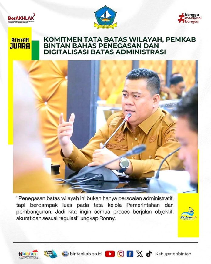 “Bintan sejatinya telah memiliki data batas wilayah di setiap Kecamatan. Namun, sebagian besar data masih tersimpan dalam bentuk dokumen fisik dan belum terdigitalisasi secara menyeluruh,” kata Ronny.