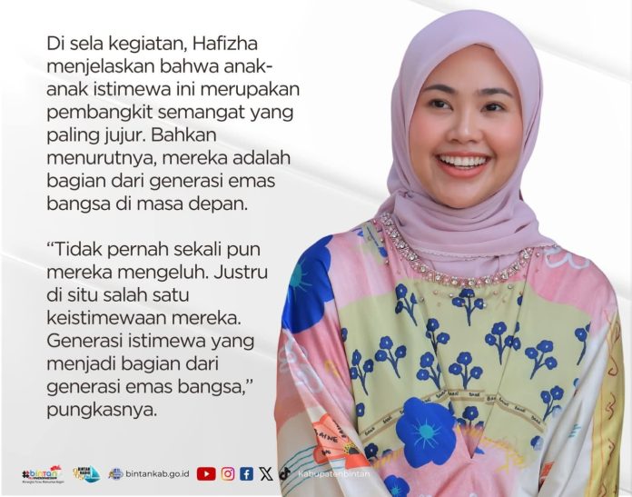 Setibanya di lokasi, istri Bupati Bintan Roby Kurniawan itu, langsung menyapa para pelajar SLB dengan penuh kehangatan. “Hari ini khusus datang, ketemu dengan anak-anak Ibu yang cantik-cantik dan ganteng-ganteng. Anak-anak Ibu semangat semua ya,” sapa Hafizha disambut suara lantang dan senyum ceria seluruh pelajar.