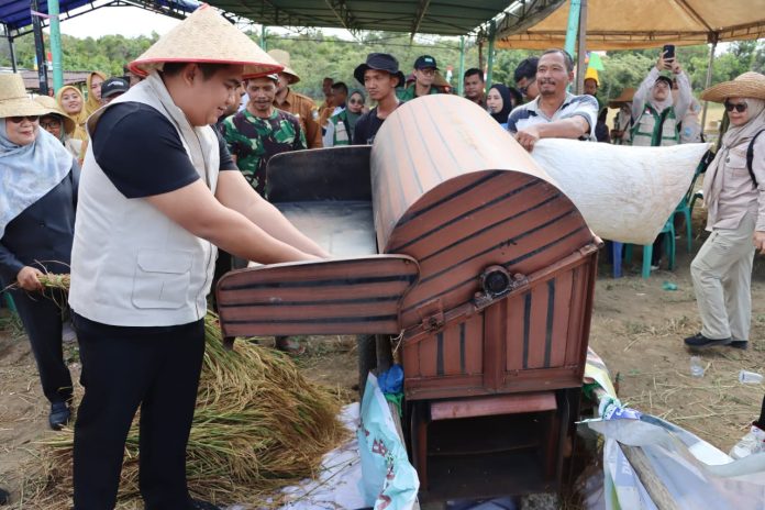 BINTAN, KABARTERKINI.co.id – Bupati Bintan Roby Kurniawan dengan penuh semangat memanen padi gogo di Kampung Sei Jeram, Desa Lancang Kuning, Kecamatan Bintan Utara, Senin 26 Januari 2026. Didampingi, antara lain, Sekda Bintan Ronny Kartika, panen padi gogo ini merupakan panen perdana.