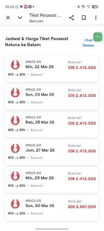 5. Maskapai Wing Air dari Ranai (Natuna/NTX) – Hang Nadim (Batam/BTH), Ahad 29 Maret 2026, harga tiket Rp2.413.300, kelas Ekonomi.