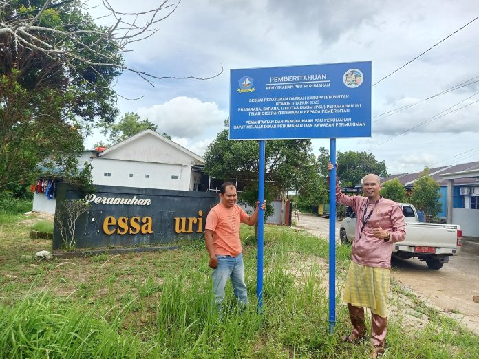 BINTAN, KABARTERKINI.co.id -Dinas Perumahan dan Kawasan Permukiman (Perkim) Bintan telah melaksanakan pemasangan papan plang pada kawasan perumahan yang telah menyerahkan Prasarana, Sarana, dan Utilitas Umum (PSU) kepada Pemerintah Kabupaten Bintan.