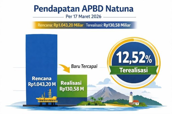 NATUNA, KABARTERKINI.co.id – Postur APBD Natuna, dikutip dari Sistem Informasi Keuangan Daerah atau SIKD per 17 Maret 2026, menerangkan tentang Pendapatan Daerah, dari pagu anggaran sekitar Rp1 triliun atau tepatnya Rp1.043,20 miliar, realisasi sebesar Rp130,58 miliar atau 12,52 persen. Sebelumnya per 8 Maret 2026, realisasi sebesar Rp120,48 miliar atau pemasukan naik sekitar Rp10 miliar.
