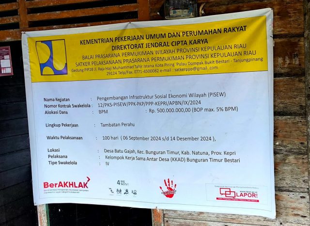 Sementara dari plang proyek di terima KABARTERKINI.co.id, pembangunan Tambatan Perahu Desa Batu Gajah, anggarannya dari Kementerian Pekerjaan Umum dan Perumahan Rakyat (PUPR), Direktorat Jenderal Cipta Karya, Balai Prasarana Permukiman Wilayah Provinsi Kepri, Satker Pelaksanaan Prasarana Permukiman Provinsi Kepri.
