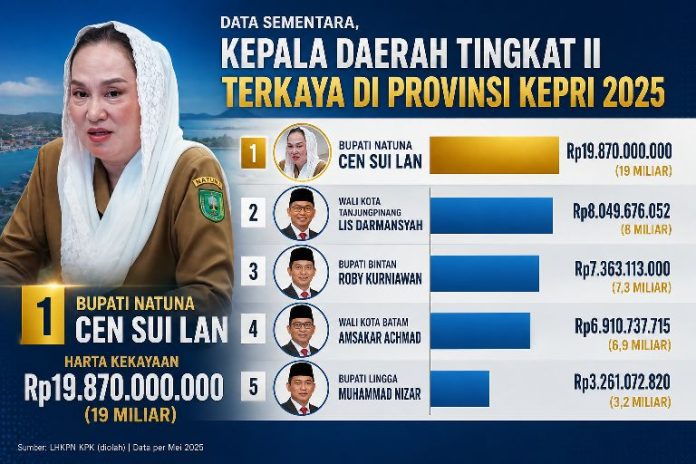 NATUNA, KABARTERKINI.co.id – Sementara Cen Sui Lan, Kepala Daerah Tingkat II terkaya di Provinsi Kepulauan Riau (Kepri). Hal ini sesuai Laporan Harta Kekayaan Pejabat Negara atau LHKPN 2025. Jumlah harta kekayaan Bupati Natuna 2025-2030 itu, sekitar Rp19 miliar atau tepatnya, Rp19.870.000.000.