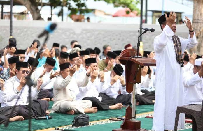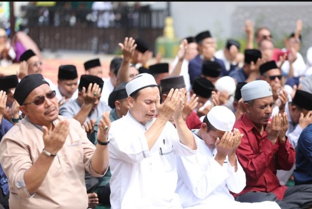 TANJUNGPINANG, KABARTERKINI.co.id – Gubernur Kepri Ansar Ahmad beserta jajarannya turut mengikuti sholat Istisqa di halaman Balai Adat Melayu, Pulau Penyengat, Sabtu 28 Maret kemarin. Sholat bertepatan dengan 8 Syawal 1447 Hijriah ini, meminta pada Alloh Subhana Wa Taala agar menurunkan hujan di tengah kemarau panjang di Kepri akhir-akhir ini.