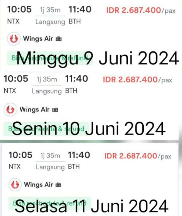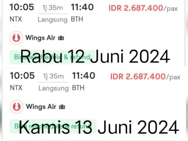 1. Maskapai Wing Air dari Ranai (Natuna/NTX) – Hang Nadim (Batam/BTH), Ahad 9 Juni 2024, harga tiket Rp2.687.400.