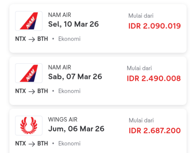 3. Maskapai Wing Air dari Ranai (Natuna/NTX) – Hang Nadim (Batam/BTH), Ahad 8 Maret 2026, harga tiket Rp2.687.200, kelas Ekonomi.