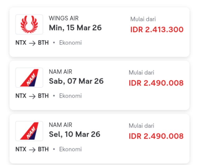 2. Maskapai NAM Air dari Ranai (Natuna/NTX) – Hang Nadim (Batam/BTH), Sabtu 7 Maret 2026, harga tiket Rp 2.490.008, kelas Ekonomi.