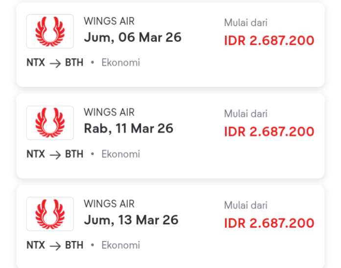 1. Maskapai Wing Air dari Ranai (Natuna/NTX) – Hang Nadim (Batam/BTH), Jumat 6 Maret 2026, harga tiket Rp2.687.200, kelas Ekonomi.