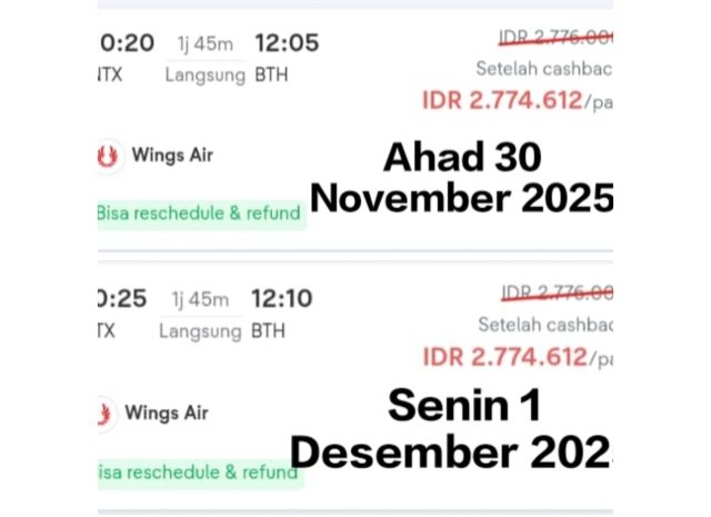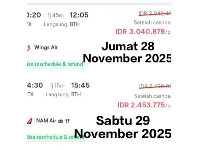 1. Maskapai Wing Air dari Ranai (Natuna/NTX) – Hang Nadim (Batam/BTH), Jumat 28 November 2025, harga tiket Rp3.040.878.