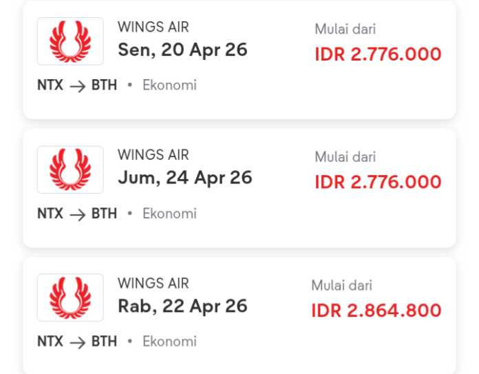 6. Maskapai Wing Air dari Ranai (Natuna/NTX) – Hang Nadim (Batam/BTH), Jumat 24 April 2026, harga tiket Rp2.776.000, kelas Ekonomi.