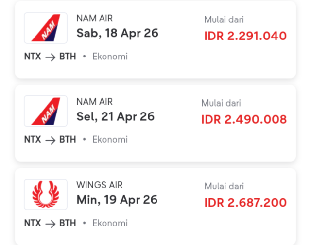 1. Maskapai NAM Air dari Ranai (Natuna/NTX) – Hang Nadim (Batam/BTH), Sabtu 18 April 2026,  harga tiket Rp2.291.040, kelas Ekonomi.