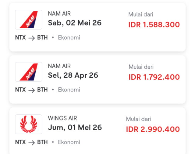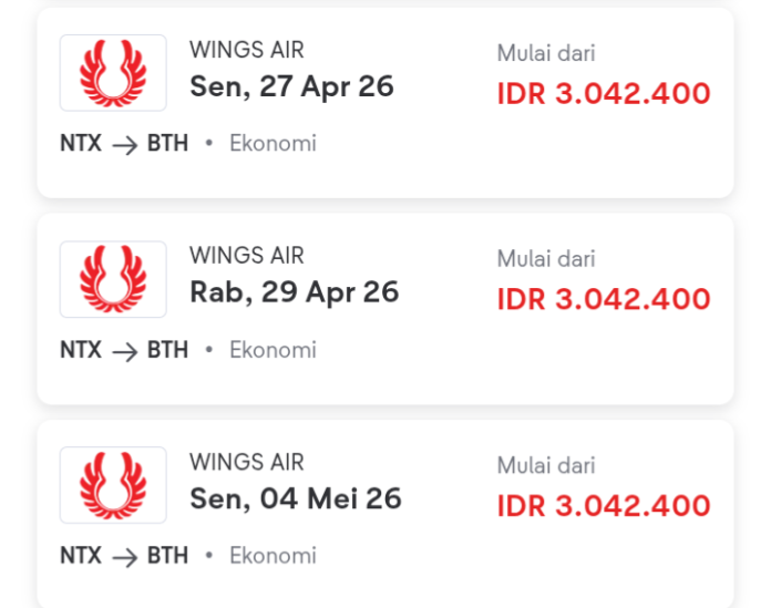 1. Maskapai Wing Air dari Ranai (Natuna/NTX) – Hang Nadim (Batam/BTH), Senin 27 April 2026, harga tiket Rp3.042.400, kelas Ekonomi.