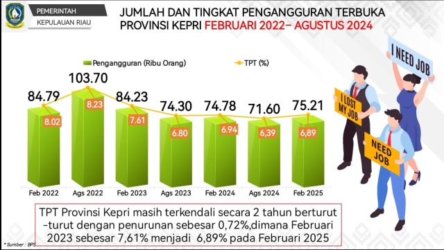 Sementara data BPS, tingkat pengangguran terbuka kepri menunjukkan masih dalam kondisi terkendali dalam dua tahun berturut-turut atau turun sebesar 0,72 persen. Tingkat pengangguran terbuka ini mengalami penurunan di tujuh kabupaten/kota di Kepri dalam rentang waktu 2020-2024.