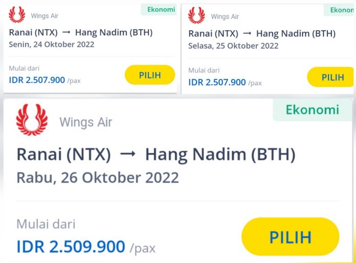 1. Maskapai Wing Air dari Ranai (Natuna/NTX) – Hang Nadim (Batam/BTH), Senin 24 Oktober 2022, harga tiket Rp2.507.900.