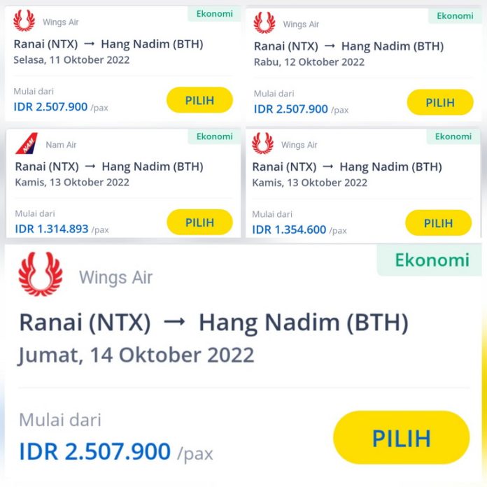 1. Maskapai Wing Air dari Ranai (Natuna/NTX) – Hang Nadim (Batam/BTH), Selasa 11 Oktober 2022, harga tiket Rp2.507.900.
