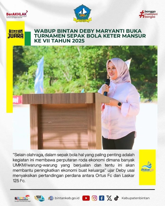BINTAN, KABARTERKINI.co.id – Wakil Bupati Bintan Deby Maryanti membuka secara resmi Turnamen Sepakbola Keter Mansur ke-VII Tahun 2025. Pembukaan berlangsung di Lapangan Keter Mansur, Tembeling Tanjung, Ahad 22 Juni 2025.